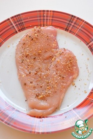 Куриное филе приправьте смесью специй и солью с двух сторон, оставьте на 15 минут