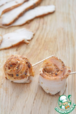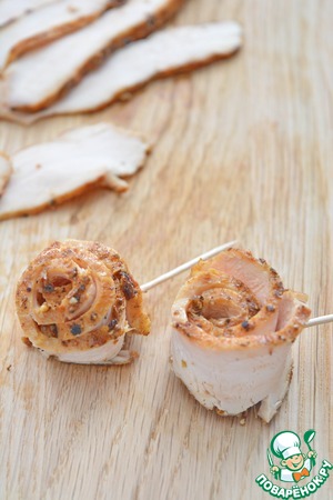 Берите по два ломтика и сверните их рулетиком, скрепите зубочистками