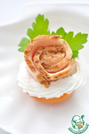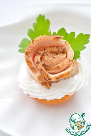 Сверху поместите "розочку" из куриного филе и украсьте зеленью.
