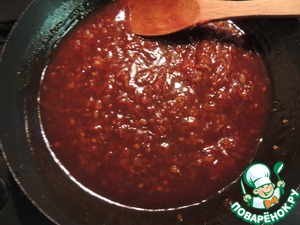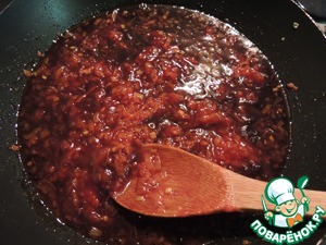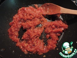 • В это время наш лук уже приготовился, добавляем 2 ст. л. томатной пасты, хорошо перемешиваем и обжариваем еще пару минут.