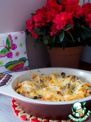 Полить равномерно скумбрию заливкой. Сыр при этом остается сверху.