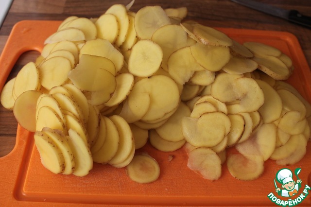 Картошку хорошо вымоем (чистить необязательно) и нарежем очень тонкими кружочками.
