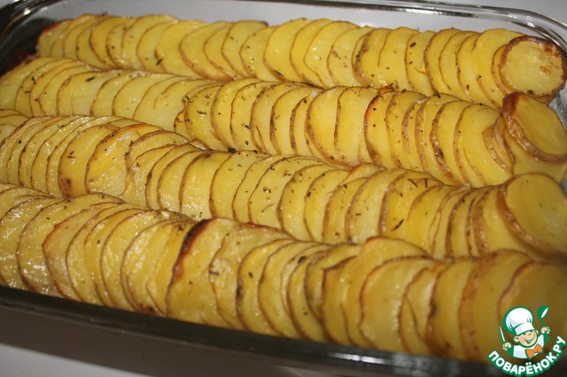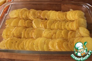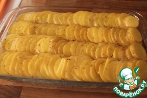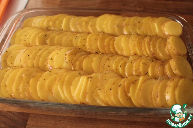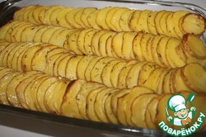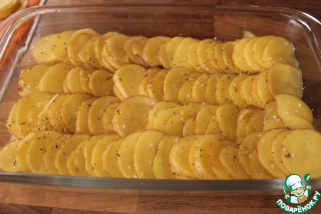 Форму для запекания смазываем растительным маслом и чешуйкой выкладываем картофельные ряды.