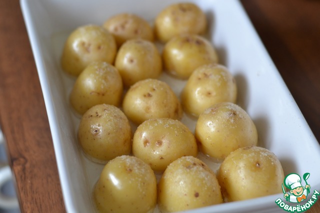 Кисточкой смазать верх картофеля подсолнечным маслом.