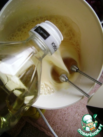 Понемногу вливать масло, продолжая взбивать, до образования пышного крема. -