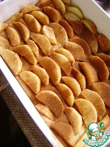 В смазанную форму вылить тонкий слой теста, разложить яблоки, присыпать корицей.
