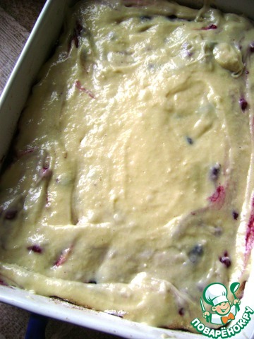 Залить остатками теста, распределяя его на весь пирог.