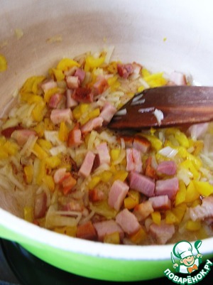 Добавить лук и перец, помешивая, пассеровать до легкой позолоты. -