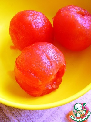Помидоры обесшкурить и нарезать кубиками.