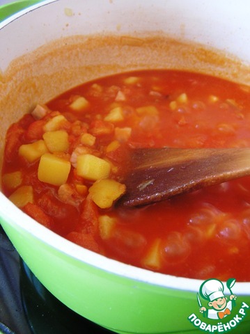 Влить томатный сок и варить пару минут, снимая пену. -