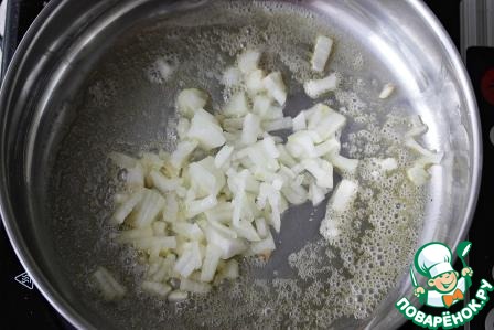 В сотейнике растопить сливочное масло, выложить мелко нарезанный лук и спассеровать его. -
