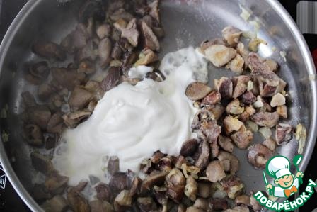 Присыпать грибы мукой, чуть-чуть обжарить, постоянно помешивая. -