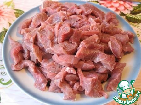 Говядину помыть, обсушить и нарезать кусочками длиной 2 см. -