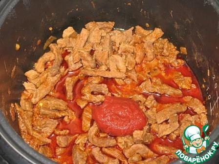 Добавить к мясу томатную пасту, перемешать.