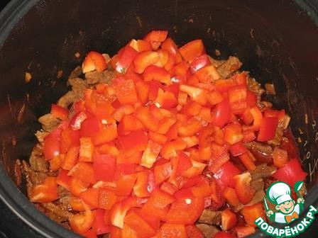Болгарский перец помыть, почистить, нарезать кубиками и добавить к мясу, перемешать и тушить ещё 30 минут.