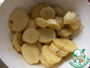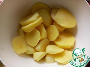 У меня картофель был довольно крупный и с грубоватой кожурой, поэтому я его почистила и нарезала на толстые кружочки.