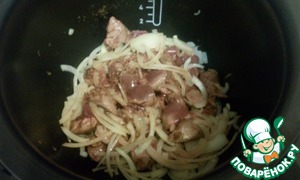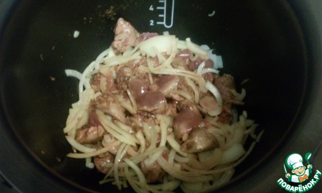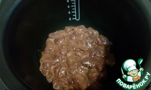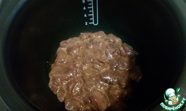 Выставляем режим жарка и кладем печень, без добавления масла потому, что мы мариновали ее в масле, а чаша мультиварки антипригарная.