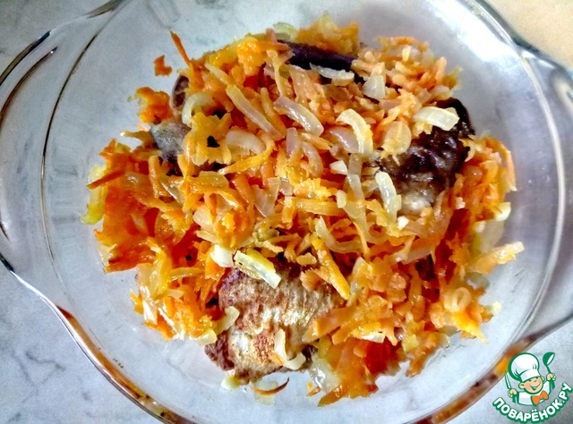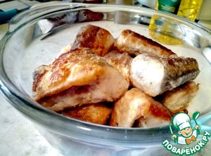 Обжаренную рыбу выкладываем на овощи в кастрюлю.