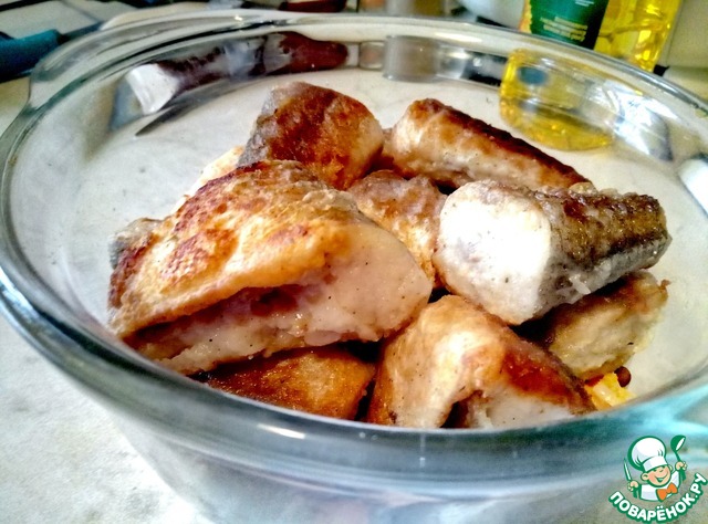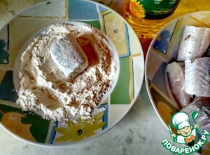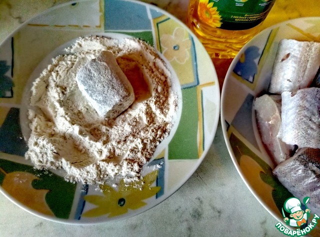 Займемся рыбой. Тушки хека (в моем случае. Можно использовать минтай, это не принципиально) разрезать на порционные кусочки. В муку добавить немного соли и молотого черного перца. Обвалять рыбу в муке и обжарить в растительном масле до золотистой корочки со всех сторон.