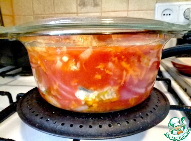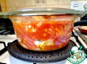 Ставим на самый маленький огонь и забываем о рыбе часа на 2,5-3. В данном случае чем дольше - тем вкуснее. Форму рыба точно не потеряет за счет предварительной обжарки. Единственное условие - очень маленький огонь.