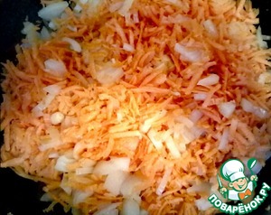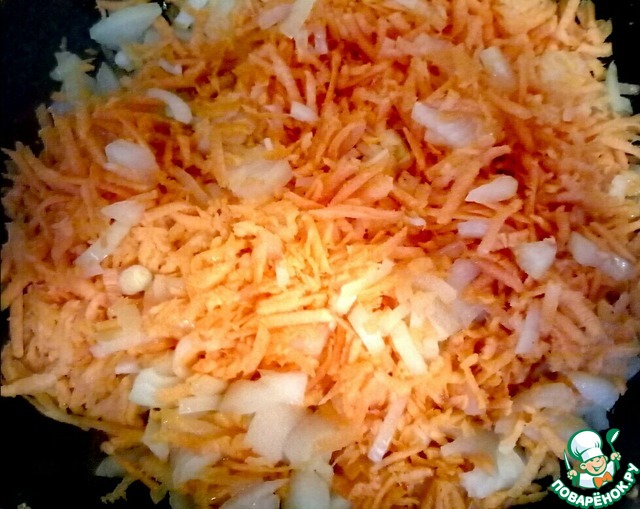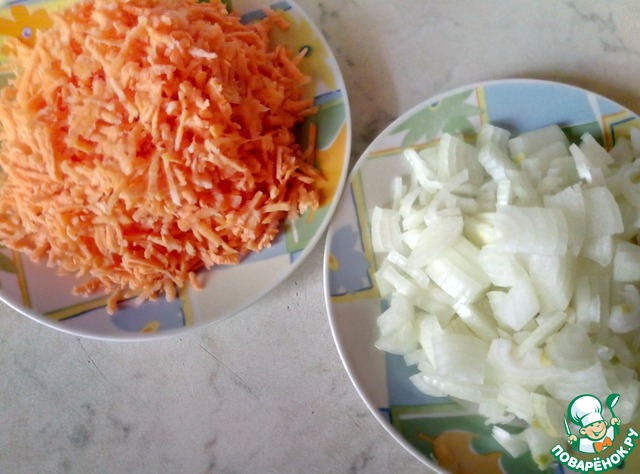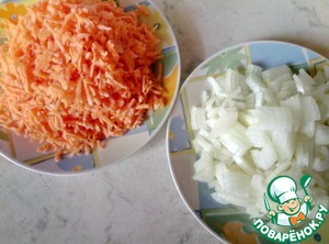 Первым делом морковь натираем на крупной терке, лук режем четверькольцами.