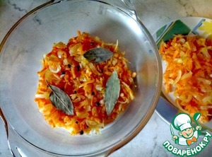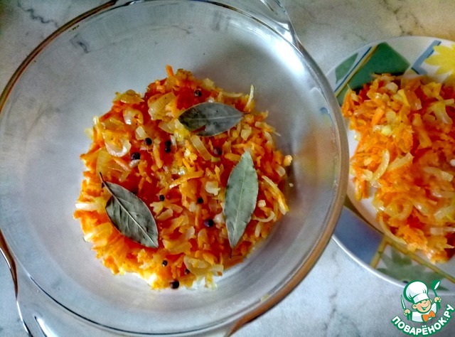 Затем обжаренные овощи делим на две части - одну выкладываем в кастрюльку, в которой будем томить рыбу, добавляем лавровый лист, душистый перец и несколько горошин черного перца. Вторую часть овощей откладываем отдельно.