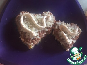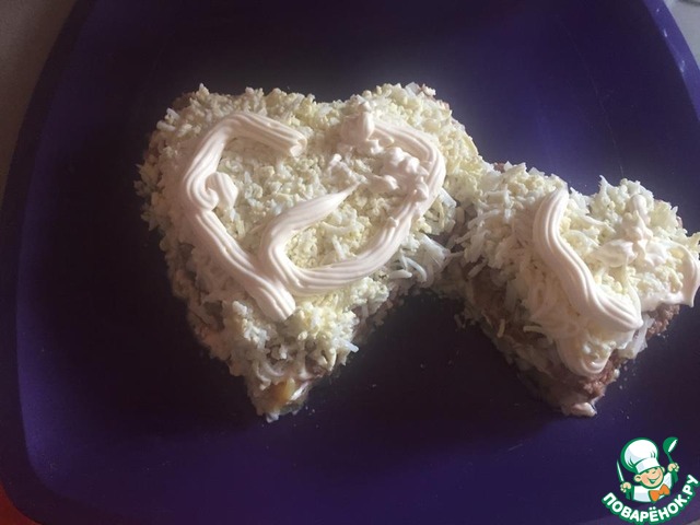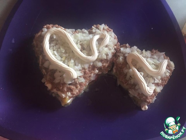 В принципе, если заменить рыбные консервы на сельдь, то получится всеми любимая Селедка под шубой, но подача и оформление салата посвящены Дню Святого Валентина