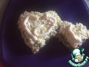 На широкое плоское блюда выкладываем влажными руками картофель и формируем из него два сердца-большое и маленькое, смазываем майонезом, я делала это при помощи кондитерского шприца.