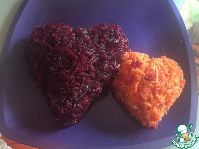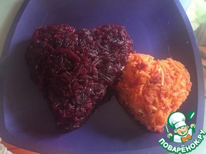 На большое сердце выкладываем натертую свеклу, на маленькое тертую морковь.