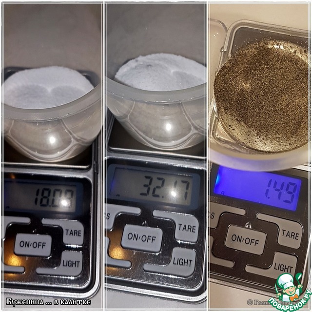 • Основными компонентами засолки будут три. Нитритная соль – восемнадцать граммов (т. е. один процент от веса). Обычная поваренная соль – надо брать тоже один процент от веса мяса (мы взяли чуть меньше). Перец. Сколько взято – видно на картинке, но тут дело вкуса. Остальные специи оставляю «за кадром». Тут все зависит от ваших вкусов и пристрастий.