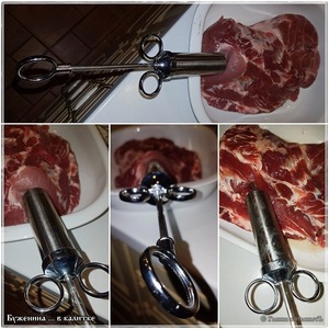 Дальше, используя специальный такой шприц – это самый удобный инструмент, вводим этот раствор в кусок мяса. Втыкать шприц со всех сторон и через небольшие промежутки.