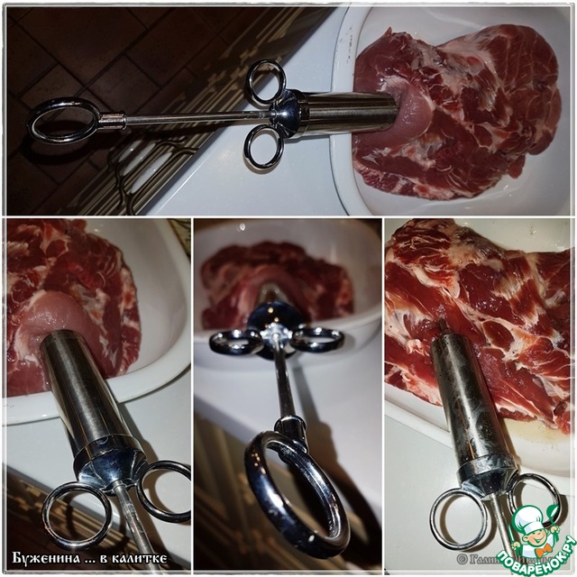 • Дальше, используя специальный такой шприц – это самый удобный инструмент, вводим этот раствор в кусок мяса. Втыкать шприц со всех сторон и через небольшие промежутки.