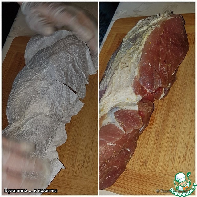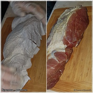 • Когда мясо из лотка достанем, то надо его хорошенько обсушить. Бумажные полотенца тут самое лучшее.