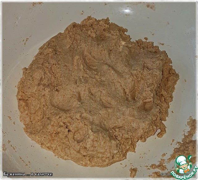 • Пока мясо будет проветриваться, надо сколотить ту самую калитку. Ржаную. Три компонента. Ржаная мука, соль, вода. Смешать в пропорциях, чтобы не пересолить, конечно, и получить вот такое тесто. Мягкое, но не текучее. Объем теста... примерно около двух стаканов.