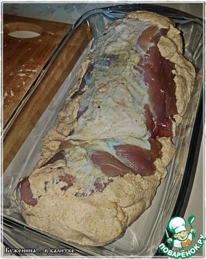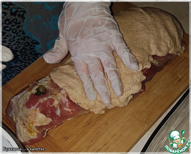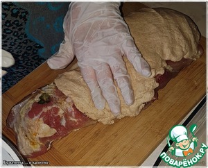• И обмазываем мясо тестом с другой стороны, тщательно заключая весь кусок в тестовый кокон.