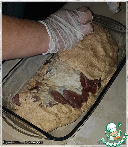 • Надо все очень тщательно проверить, уплотнить. Чтобы мясо плотно было обмазано тестом и нигде не было никаких нарушений этой калиткиной оболочки.