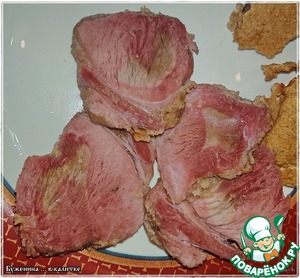 А дальше мясо отправляется в духовку. Температура духовки – сто градусов. Запекать до достижения внутри мяса температуры – семьдесят градусов.