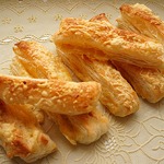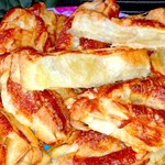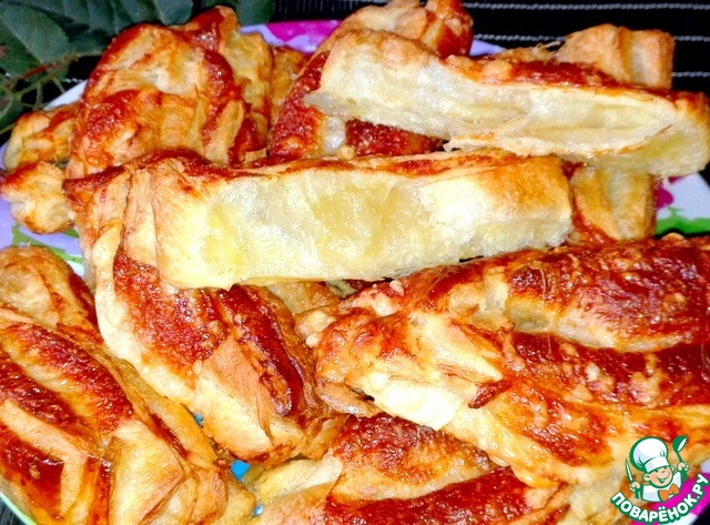 Нарезаем на полоски, примерно 0,5 см, выкладываем на противень и посыпаем оставшимся сыром. Ставим в духовку, разогретую до 200 градусов, на 15-20 минут.