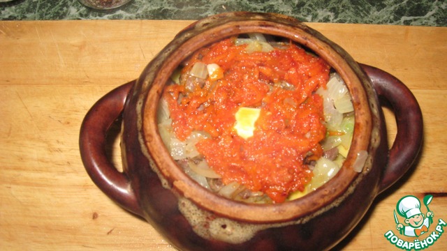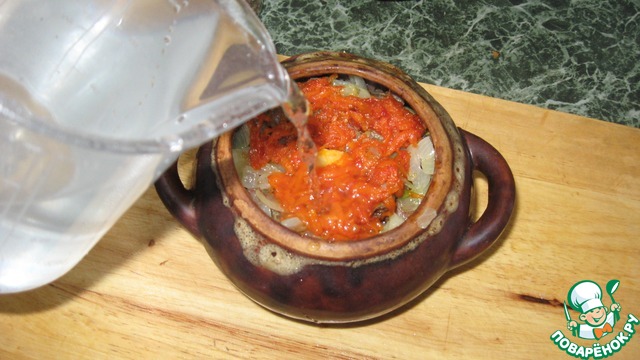 Добавляем 150-200гр воды (у меня горшок объемом 500мл) закрываем крышкой и отправляем в духовку разогретой до 200С на 50 минут! Приятного аппетита!!! Пока писала рецепт уже пустые горшочки в семье))