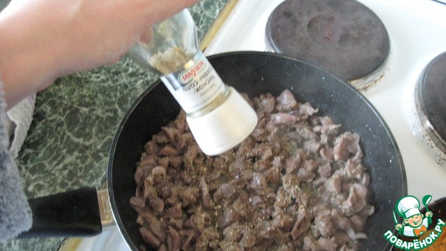 Когда из желудков выпарилась вода выключаем плиту, добавляем соль, перец молотый, молотый чеснок, приправы на свой вкус ( я добавила приправу для мяса)