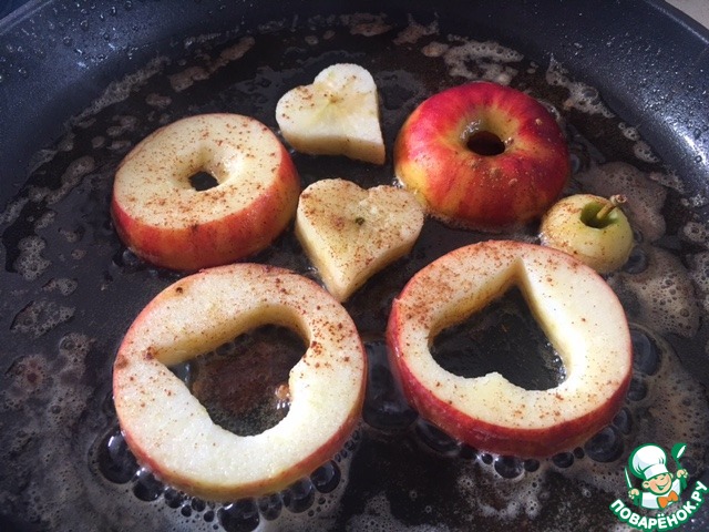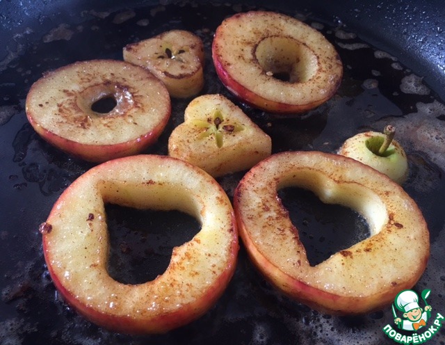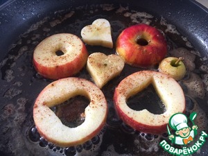 Положите в ту же сковороду масло и обжарьте яблоки с одной стороны.