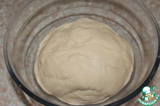 Добавляем сливочное масло и соль, замешиваем до гладкого теста 4 минуты. Скатываем в шар, помещаем его в чашку, накрываем пленкой и ставим на час в теплое место (тесто должно увеличиться вдвое).