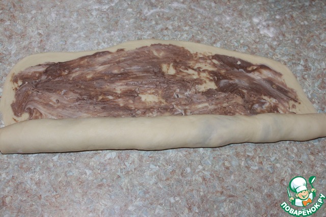Смазываем начинкой и плотненько сворачиваем в рулет. -