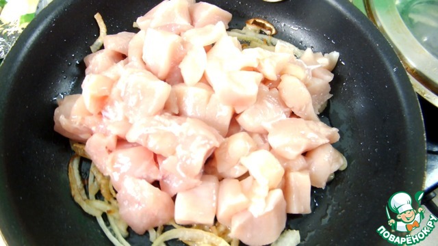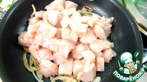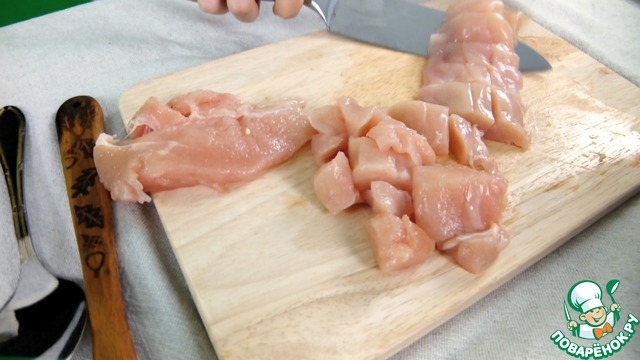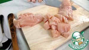 Промытое куриное филе нарезаем на небольшие кусочки