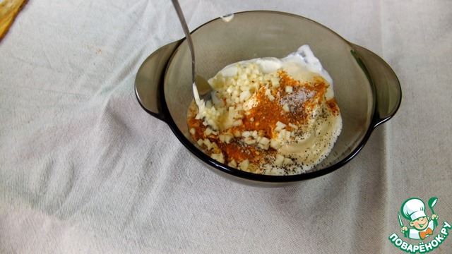 Смешиваем сметану, майонез, измельченный чеснок, соль, специи и перец