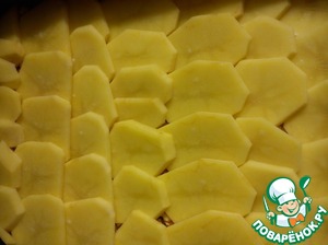 Картофель нарезать кружочками и выложить половину поверх фарша, немного посолить.