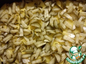 Огурцы нарезать соломкой, выложить на картофель.