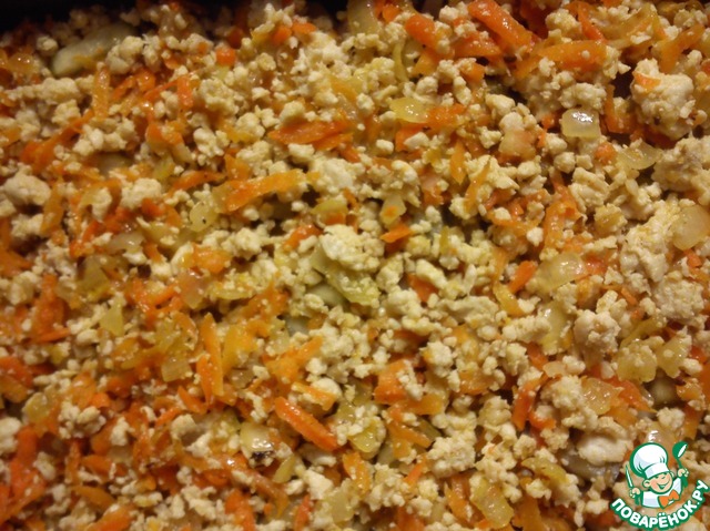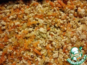 Фарш обжарить, добавить лук, затем морковь, еще немного поджарить. Посолить, поперчить.