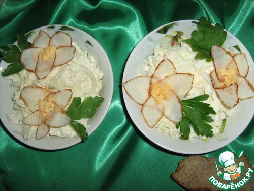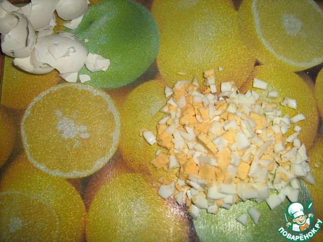 Выложить "лилии" поверх салатной массы, в серединку каждого "цветка" насыпать немного рубленного желтка.
