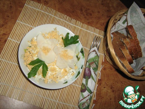 Салат с черной редькой, яйцами и зеленым яблоком. Очень вкусный и полезный. С приятной пикантной горчинкой и сладостью яблока. Лук в салате не чувствуется. Готовится салат непосредственно перед подачей: причем, сначала смешиваются черная редька, лук и яйца, а яблоко трется в последнюю очередь в салат. Потом все заправляется майонезом. Можно использовать для салата Дайкон, но в оригинале – черная редька.